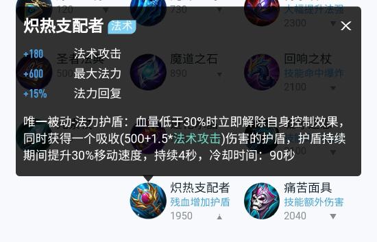 这套出装6神后的艾琳法强可以达到2000,炽热支配者被动触发的情况下可以触发一个高达3500的护盾值,再加上解控加速等效果,反手狂暴开大,可以让你血条瞬间回满。