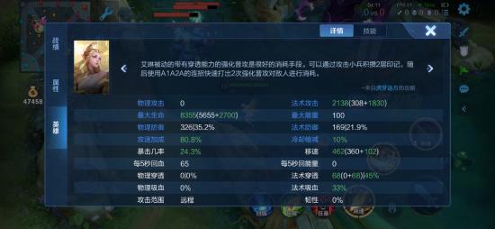 从技能看出艾琳的机动性很强,普攻和2技能都能触发位移,但一个位移极不稳定(无法穿墙) 很容易被针对,但英雄4级和后期都有很强的爆发。