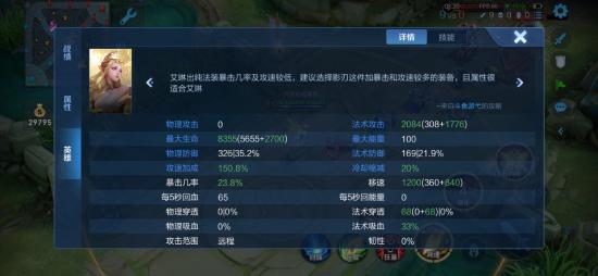 艾琳每100点法术攻击可以转化为1%暴击率。