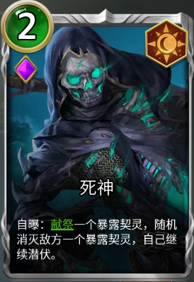 这一套牌,以“暴露”与“高伤害”为核心,术士可以通过与己方带有“遗言”效果的契灵配合,强制让对方契灵暴露,死神则可以“献祭”带有“遗言”效果的契灵,发动“遗言”效果的同时,消灭对手的契灵。