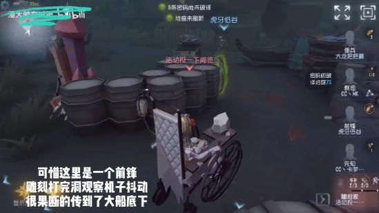这里挂角落是因为雕刻已知机子压好了,干扰机子没有意义,所以故意往远处挂,增加开门战佣兵和前锋离椅子的距离。这样如果在开门战能快速秒掉前锋,佣兵就有可能赶不到大门也被秒掉。而且挂到远处增加了佣兵跑图的距离,给雕刻守尸创造了更多的可能,在外围秒掉佣兵的可能性虽然小但是也有,如果你挂到进出就肯定没有,肯定只有平局甚至于三跑,但这样一挂就有几率三杀。这一点小细节大家可以记一记。虽然最后的结果还是平局,但这种小意识还是值得我们借鉴学习和参考的。