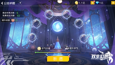 每日5次祈愿机会,探长进行祈愿时,随机获得1-6个奖励。进行改运时,有概率使本次祈愿获得更多奖励,达到6个奖励后不能再改运,每日10次改运机会。手气不够的时候可以邀请公会的成员帮您增加手气,继续祈愿哦~