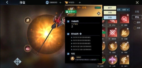 兵器除了本身强化还可以进行刻印,除了增加一定的基础属性之外,兵印在升级后还可以获得附加属性。并且每一个兵印都拥有特技,譬如上图的[追电],就较为适合拥有感电技能的赵云以及马超使用。兵印的主要获取方式为百花,以及玄镜论武。