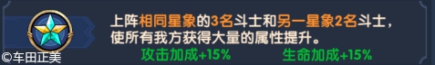 上阵相同星象的3名斗士,使所有我方获得大量的属性提升。