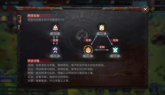 英雄们隶属于不同的阵营,看英雄界面左下角的即可知道该英雄所处的阵营,阵营之间存在克制关系。