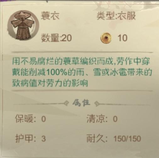 蓑衣可以百分之百抵御雨雪带来的疾病,保证你的村民每人都拥有一件蓑衣,可以不用在雨雪到来时慌乱的寻找没有蓑衣的村民。蓑衣在商人有卖,60铜币一件,价格非常亲民。