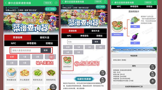 该工具可以在搜索栏中直接搜索需要查询的菜谱,点击查询对应菜谱的研究主食材、研究副食材、研究火候等内容。赶快分享给你的伙伴吧!