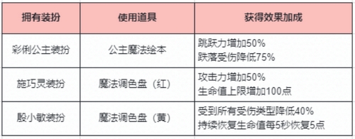 当然不同的道具对应的属性加成也会所不同,弦月魔法棒、星翼魔法棒(红&蓝)、魔仙剑就是上图的效果,而公主魔法绘本、魔法调色盘(红&黄)则有装扮和无装扮不同属性加成之分。当冒险家有变身道具无装扮时,使用道具后会和弦月魔法棒等道具一样的效果。但如果是有对应装扮,那么就不一样啦!