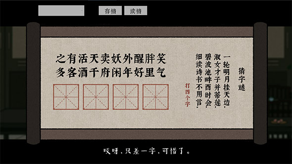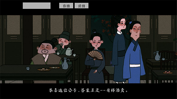 随后你便来到了春风酒楼,你在酒楼中遇到了第一个具有挑战的谜题,你需要结合游戏的背景环境、人物和场景,进行猜字谜。