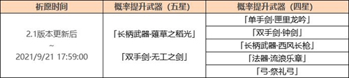 ●活动期间,四星武器「单手剑·匣里龙吟」「双手剑·钟剑」「长柄武器·西风长枪」「法器·流浪乐章」「弓·祭礼弓」的祈愿获取概率将大幅提升!
