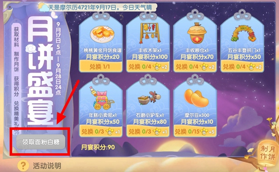 首先,自然是打开熟悉的活动列表,找到月饼盛宴,点击左下角的按钮领取面粉和白糖。