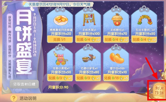 制作月饼可以获得月饼积分,制作普通月饼可以获得10积分,制作黄桃月饼可以获得20积分。 积分可以在活动页面里兑换奖励。