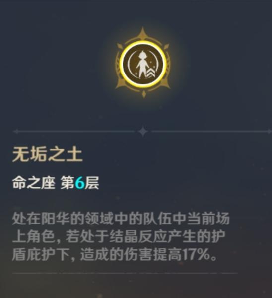 处在阳华的领域中的队伍中当前场上角色,若处于结晶反应产生的护盾庇护下,造成的伤害提高17%,配上阿贝多的元素战技可以频繁的提供结晶盾,基本可以全程吃到伤害加成。