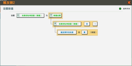 第一个数值选择函数库中玩家的“玩家的私有变量(数值)”这个变量还是选择刚刚使用过的变量。加1(也就是把零改为1)