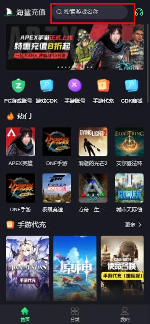 第一步,通过海鲨充值,找到我们的游戏【点击进入海鲨充值平台】;