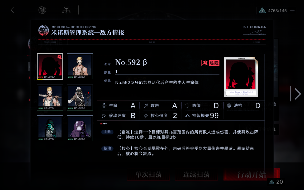难度1时,BOSS为【No.592-β】,其原型是参考【普管级禁闭者——开尔文】