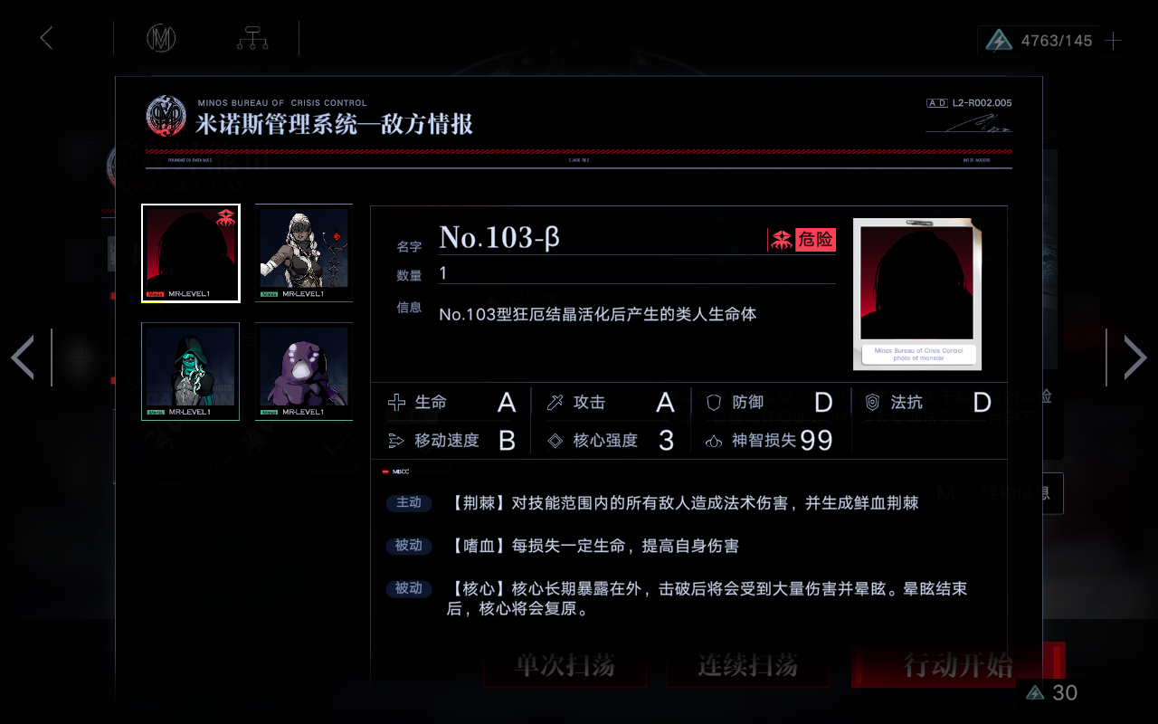 难度3时,BOSS为【No.103-β】,其原型是参考【高危级禁闭者——维多利亚】