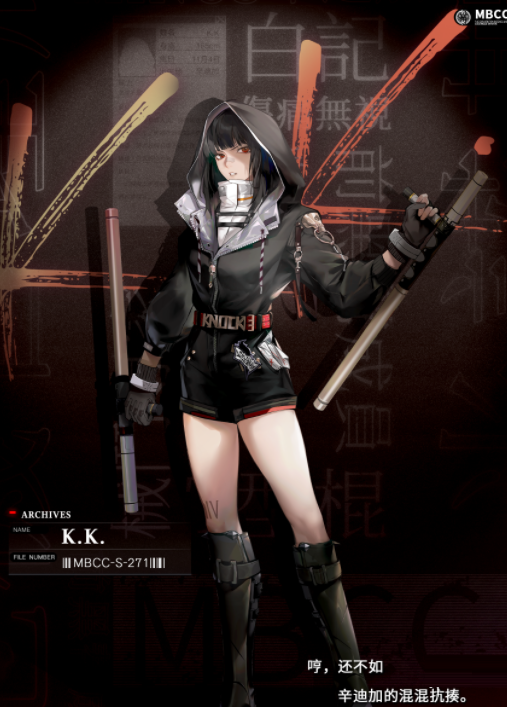 *条目III[已解锁]:异能名称【伤痛无视】。K.K.能够一定程度上无视肉体的伤痛,并且迫使身体强制反击,拥有很强的战斗续航能力。