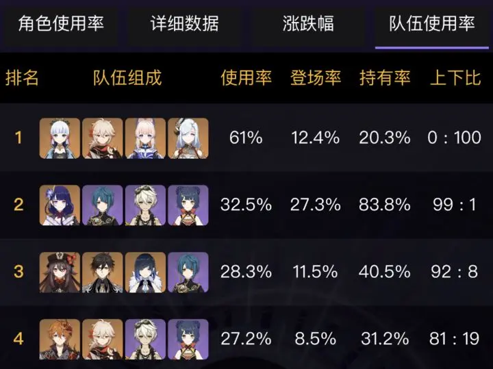 在队伍使用率方面,本期神鹤万心的使用率有了大幅提升,以61%的使用率登顶榜首,成为版本答案。与之对应,神鹤万心的成员神里绫华、申鹤、心海和枫原万叶,每个人的角色使用率也有提升。相比上期,雷国的的使用率则有不少提升,对应的万达国际有所下降。这也是比较正常的现象,因为雷国和万达国际都要抢“香班”,这两支队伍的使用率就是此消彼长的关系。