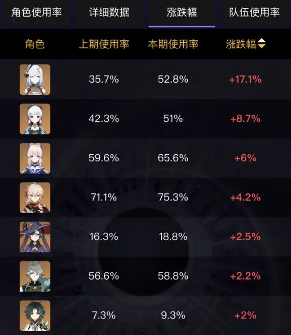 本期的深渊是3.5版本深渊的第二期,相比上期的“初见杀”,玩家对这次3.5深渊逐渐开始适应。在经过上期深渊的磨练之后,可以看出大部分玩家都是比较聪明的,在角色的选择也更加成熟,会根据深渊的环境来调整自己的阵容,知道哪些角色好打,哪些角色不好打。毕竟大部分玩家都希望自己能更轻松拿到满星,很少有玩家会头铁去选择一些比较难打的角色。这点在涨跌幅上可以明显体现出来,申鹤、神里绫华等适合本期深渊的角色,使用率都有进一步的提升。而钟离、妮露等并不适合本期深渊的环境的角色,使用率则进一步下降。