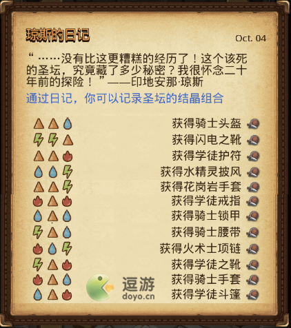 2、冒险者之森杀5个猴子没什么好说的,主要看一下遗落圣坛的装备配方,做5件就可以了,都非常简单。