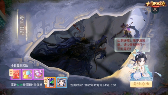 12月1日维护后-12月15日5点期间,玩家每日点亮岩画,小鲲儿都有好礼相赠。累积帮助点亮岩画14天,有机会获得iPhone14、6666元现金红包、大话20周年礼盒等限定奖励!