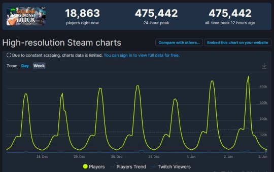 目前根据SteamDB的数据,《鹅鸭杀》同时在线玩家峰值已超过47万,而在几个月前,玩家峰值还不到1万。