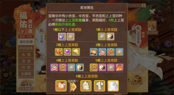 选好风水宝地后,玩家每次可投掷六根福签进行祈福,其中投出的上上签数量越多,可获得的奖励就将越丰厚。而在抽签祈福后,玩家还可免费将掷出的上上签进行锁定,锁定的福签将不再参与下回合的随机投掷,从而大大提升获得优质奖励的概率!