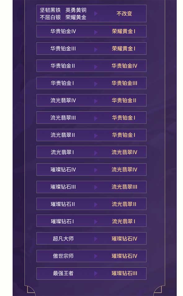 说完了赛季结束时间,相信大家最关心的就是新赛季开始初期我的段位会在新赛季继承到哪个段位吧,大家别急,小花也给大家带来了关于S4新赛季的段位继承机制,大家可以往下滑查看下哦。